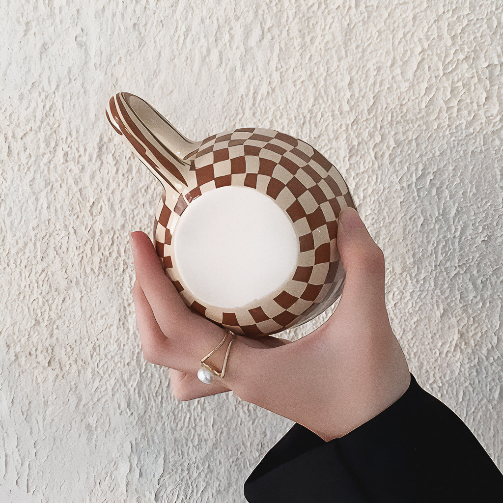 Com padronagem quadriculada e tons suaves, a Caneca Gridy tem aquele jeitinho de café lento e manhãs sem pressa :)