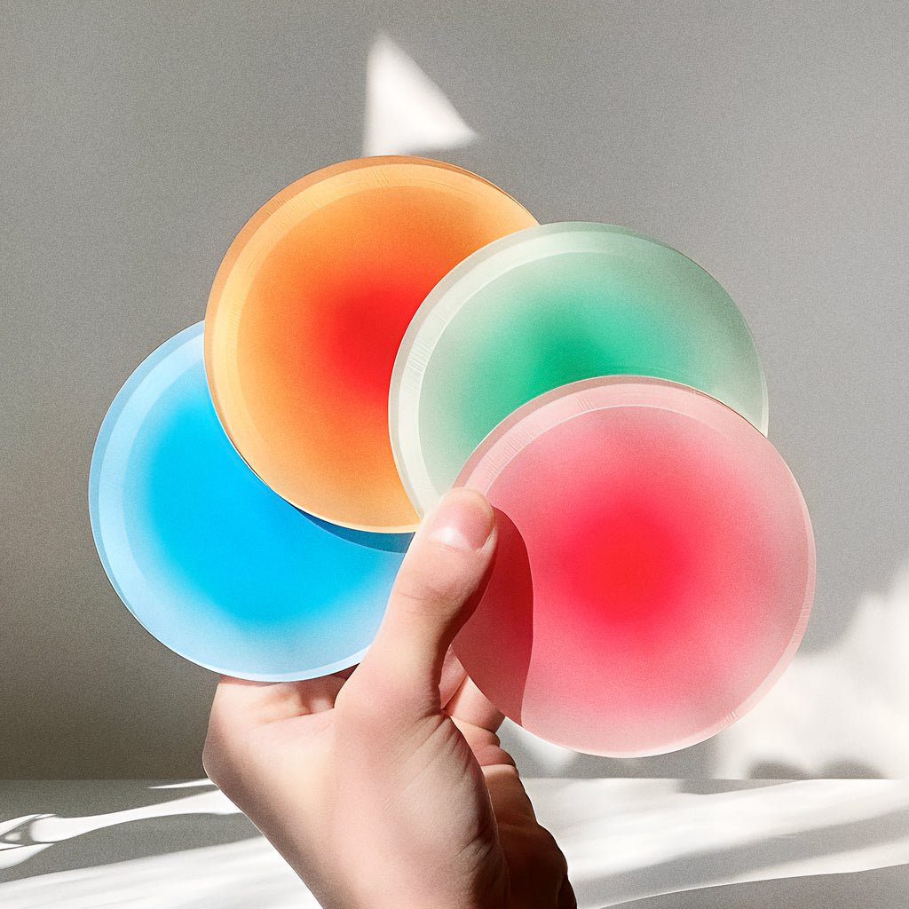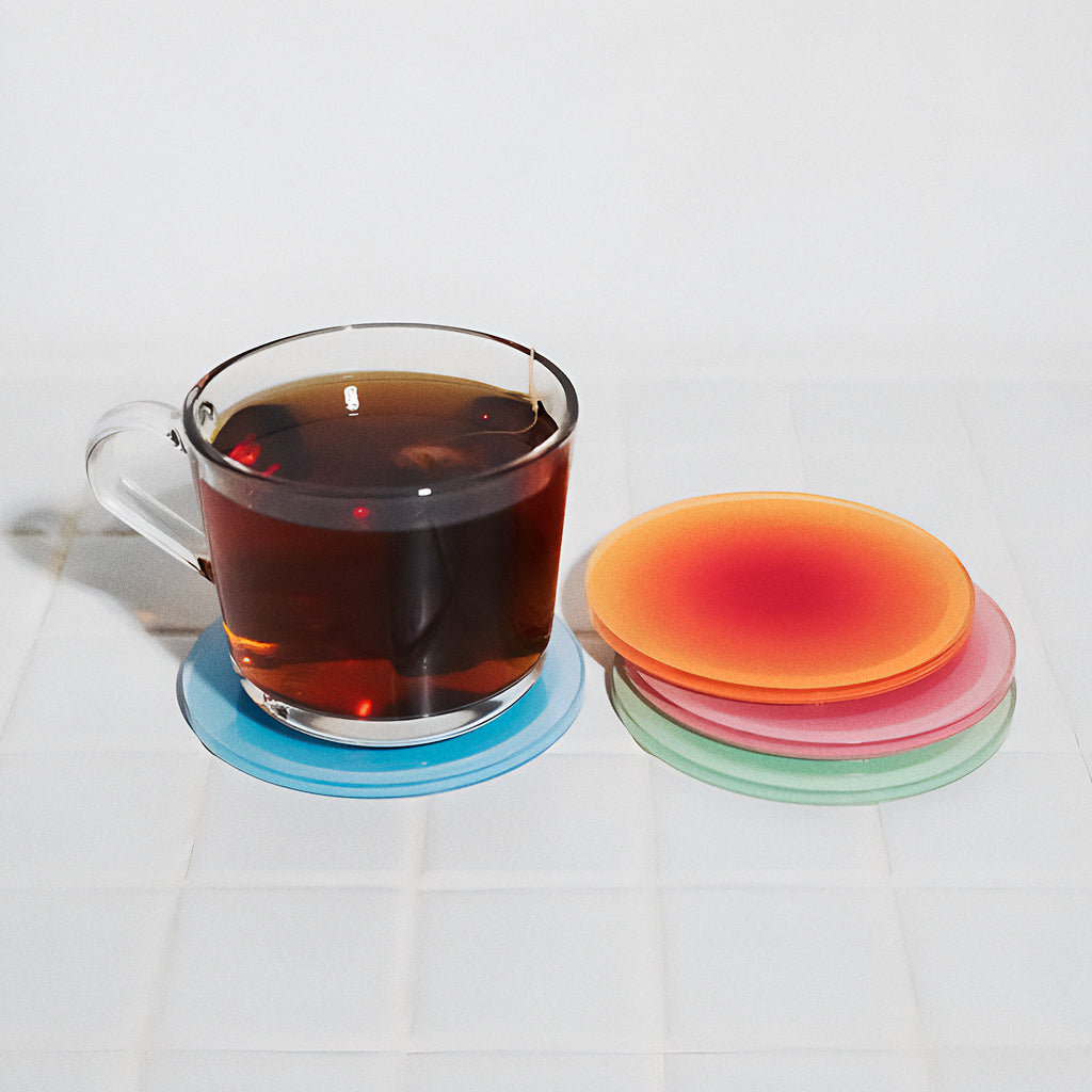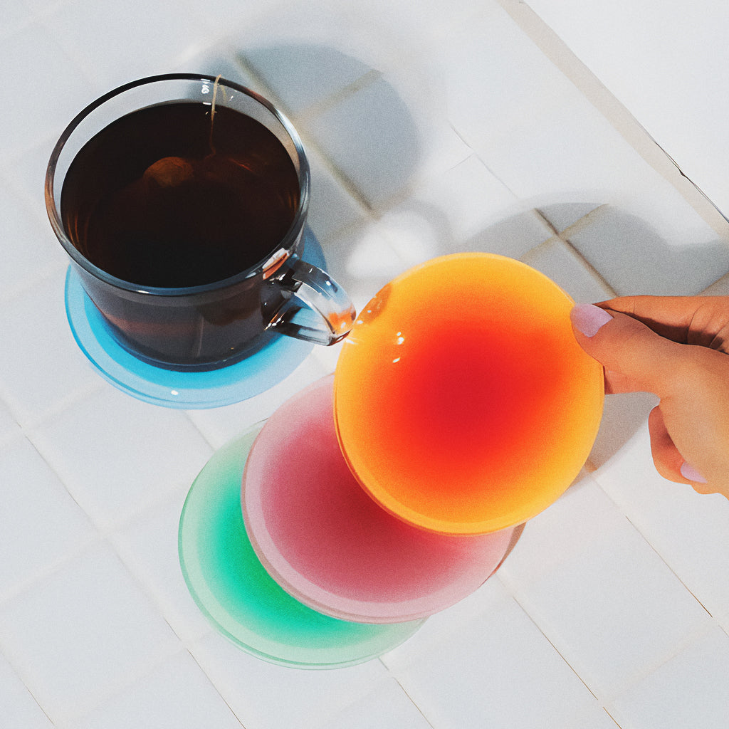 Com degradês vibrantes e acabamento translúcido, o Porta-Copos Cromia transforma qualquer pausa pra café ou drink em um pequeno espetáculo visual.