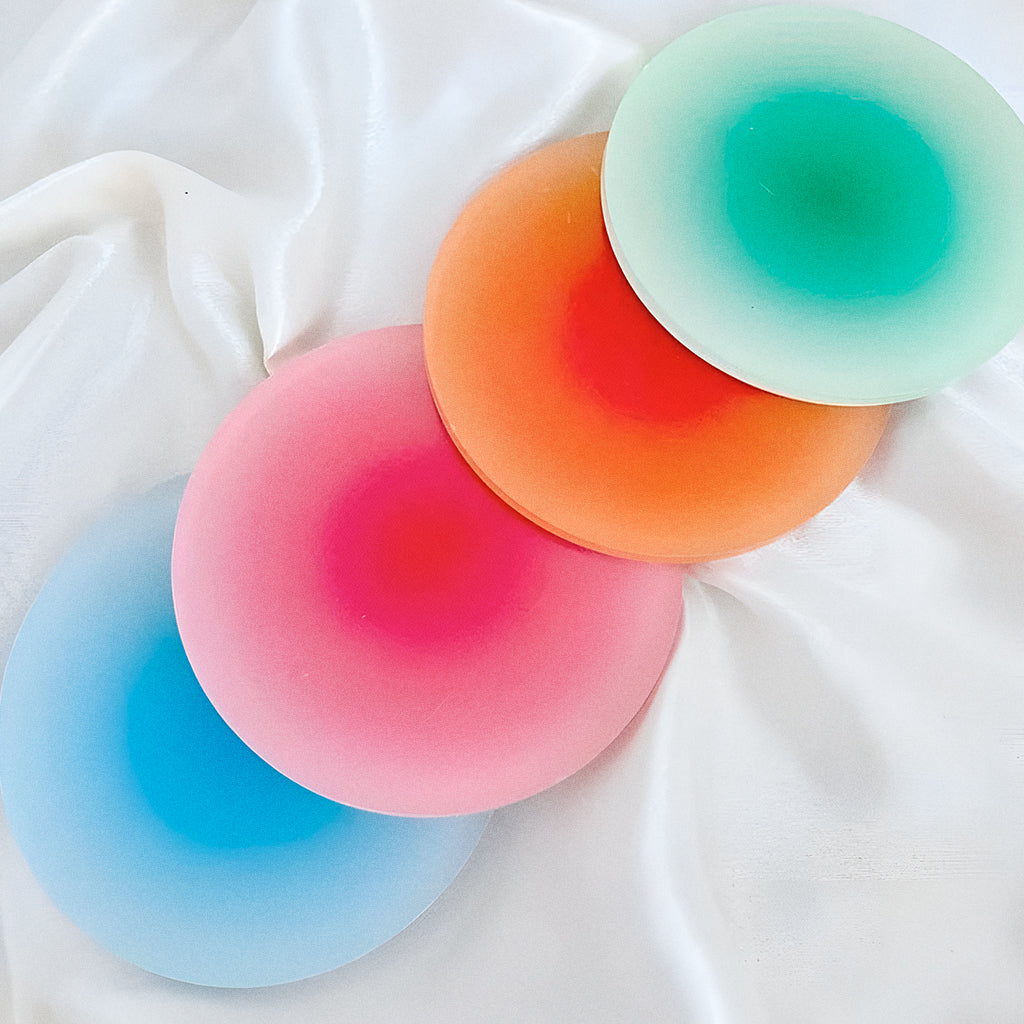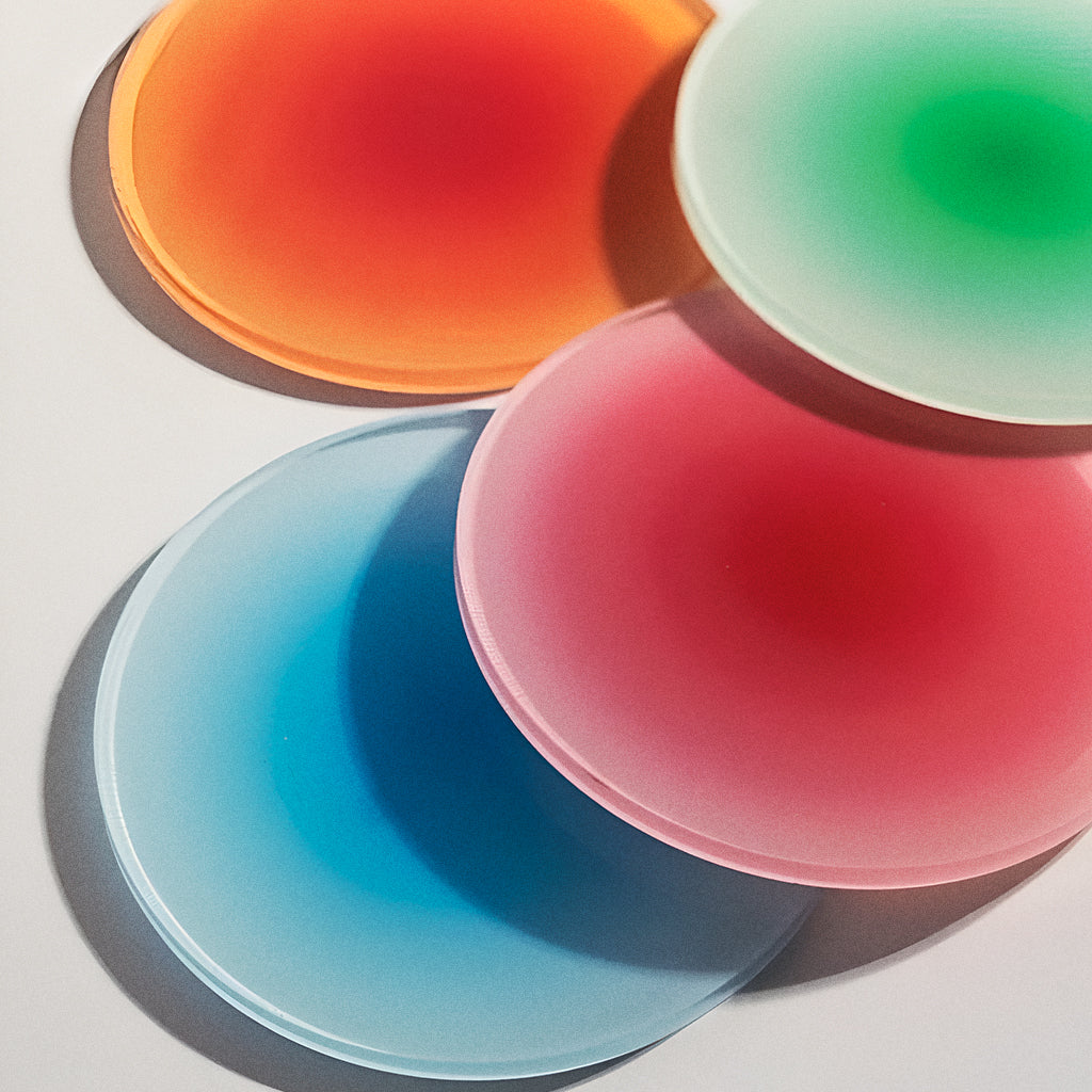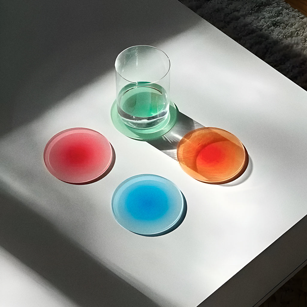 Com degradês vibrantes e acabamento translúcido, o Porta-Copos Cromia transforma qualquer pausa pra café ou drink em um pequeno espetáculo visual.